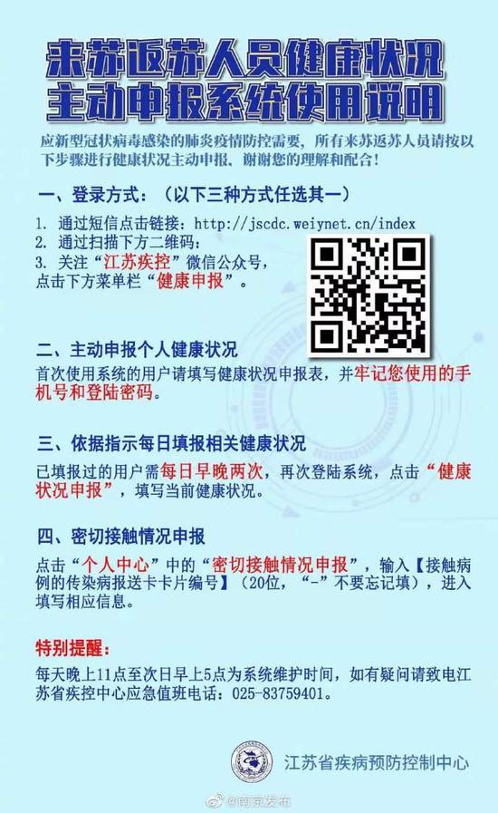 居民(mín)可(kě)以通过三种方式登陆:一是通过运营商(shāng)发送的官方短信,点击链接http://jscdc.weiynet.cn/index进行填报;二是通过扫描张贴在各检测口的二维码进行填报;三是通过“江苏疾控”微信公众号下方菜单栏“活动竞赛”进入“健康状况主动申报”进行填报。